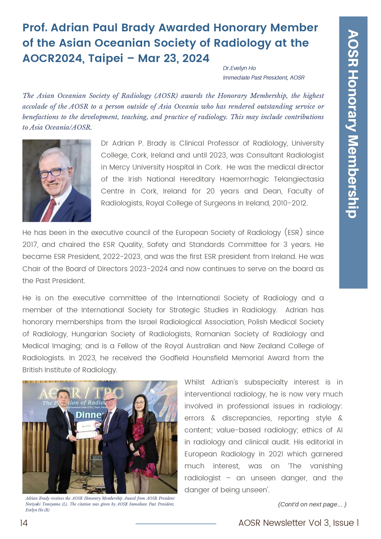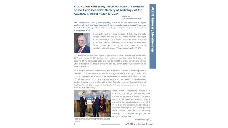 - AOSR Honorary Membership: Prof. Adrian Brady
