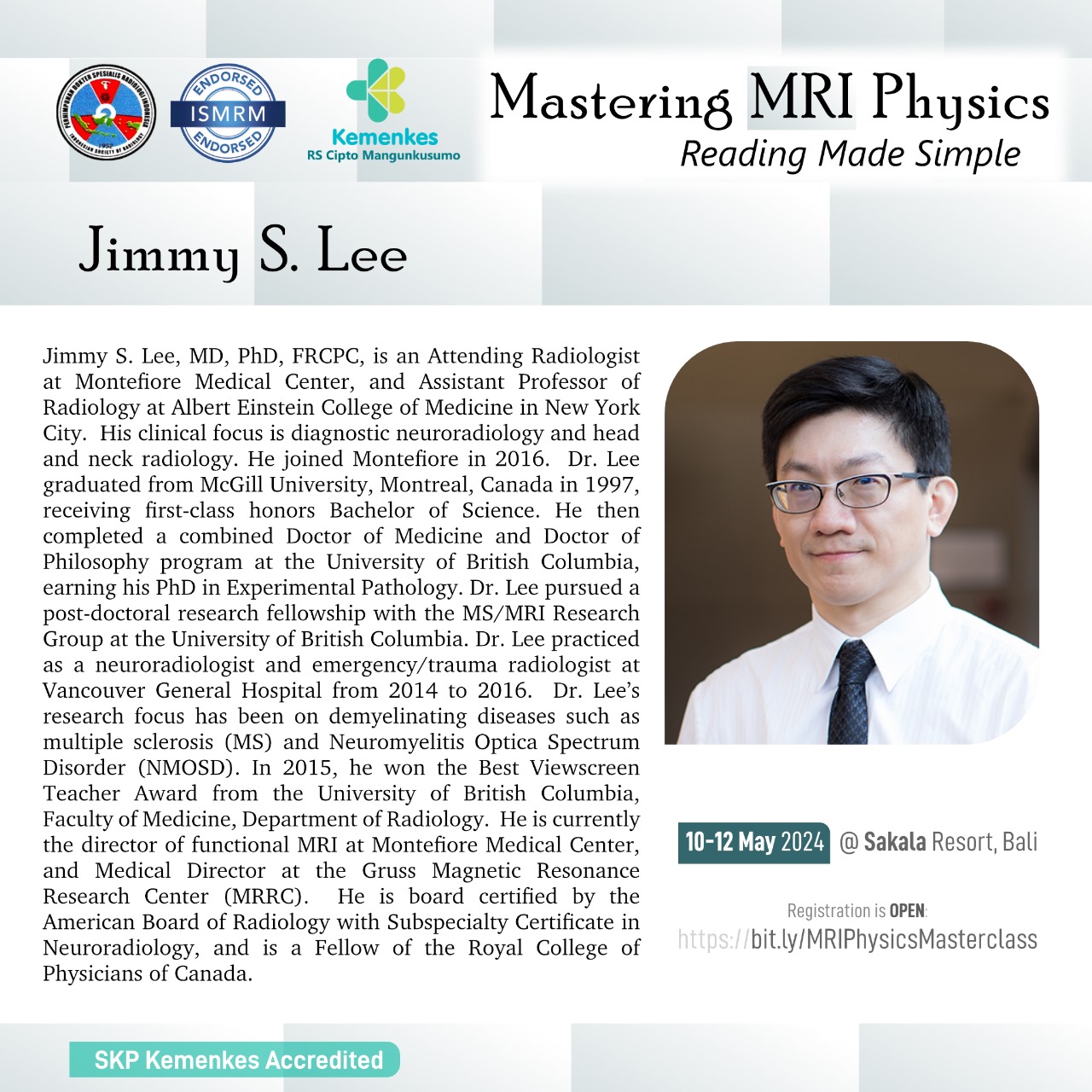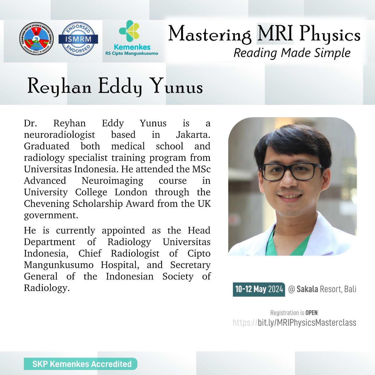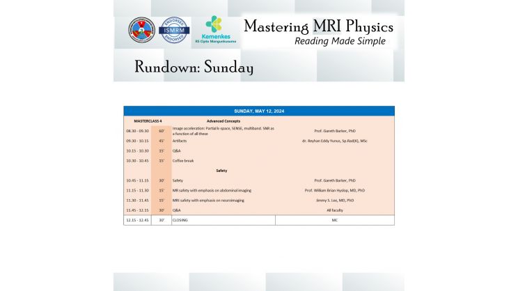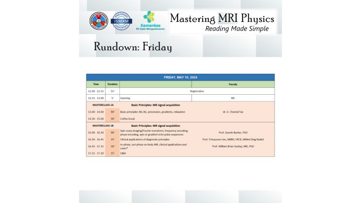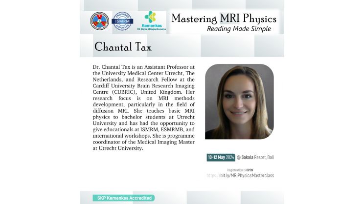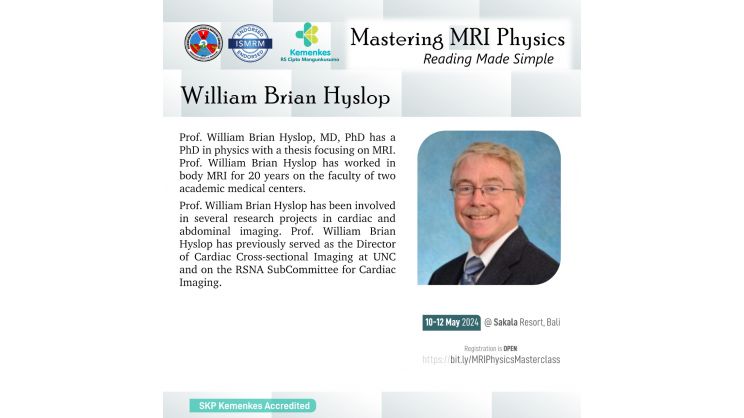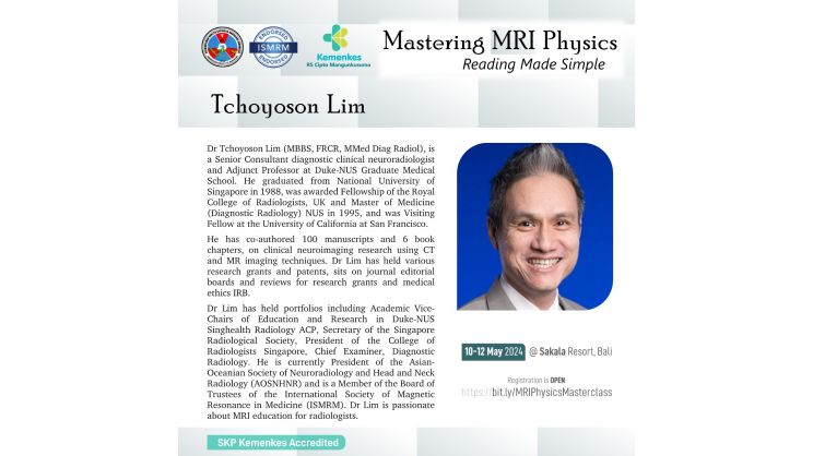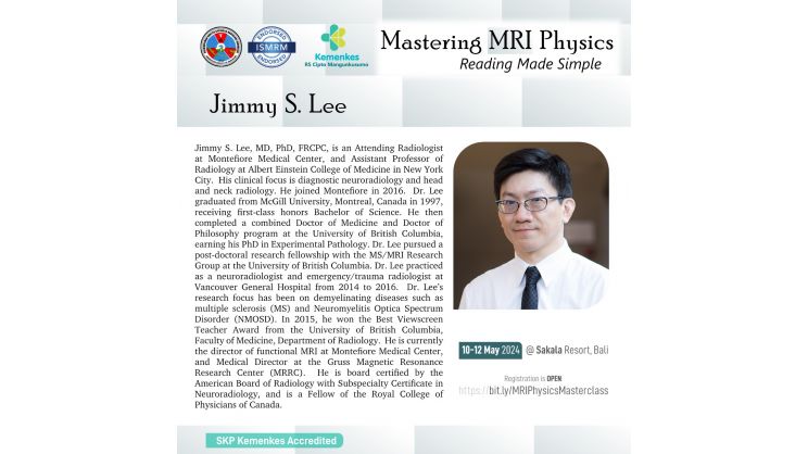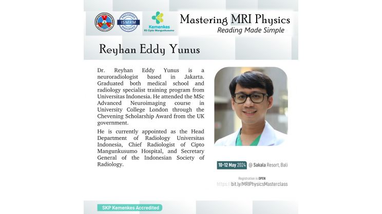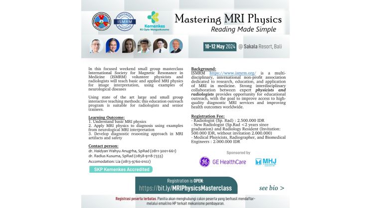 Perhimpunan Dokter Spesialis Radiologi Indonesia (PDSRI) bersama International Society for Magnetic Resonance in Medicine (ISMRM) akan menghadirkan dokter spesialis radiologi dan fisikawan medis untuk pelatihan fisika MRI secara interaktif dan aplikasinya secara klinis pada kasus-kasus dengan MRI.
