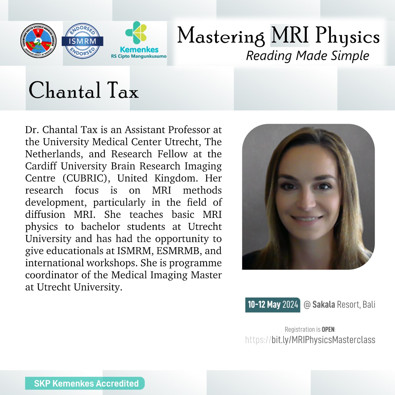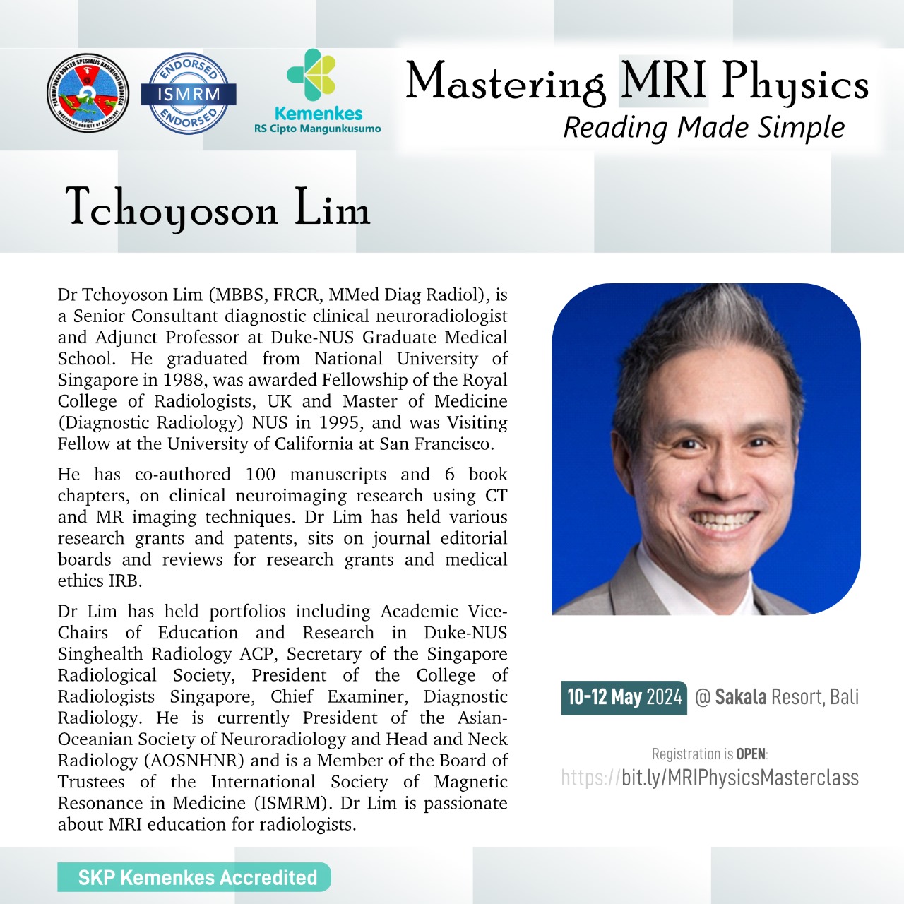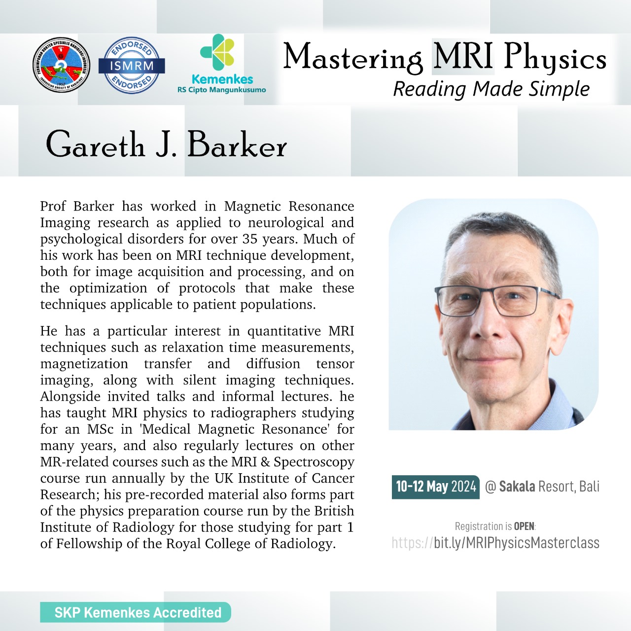 Perhimpunan Dokter Spesialis Radiologi Indonesia (PDSRI) bersama International Society for Magnetic Resonance in Medicine (ISMRM) akan menghadirkan dokter spesialis radiologi dan fisikawan medis untuk pelatihan fisika MRI secara interaktif dan aplikasinya secara klinis pada kasus-kasus dengan MRI.