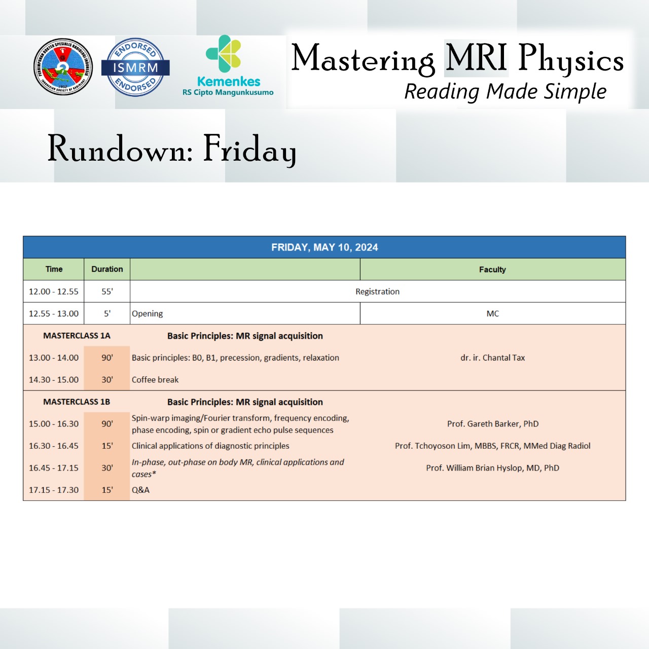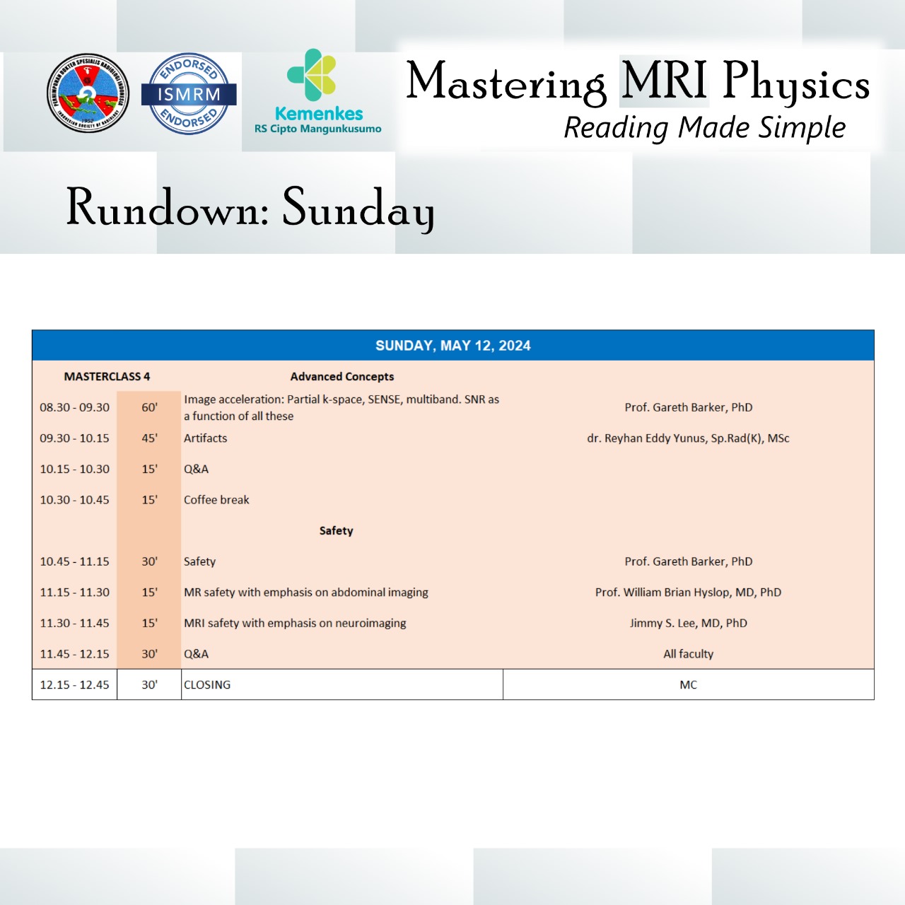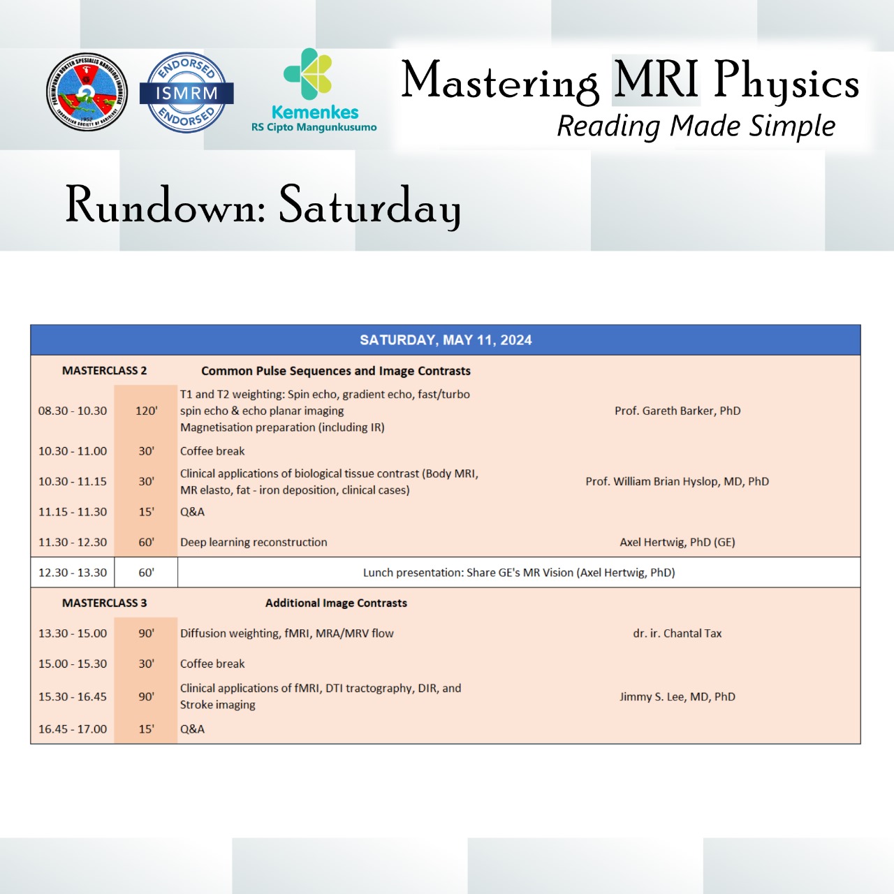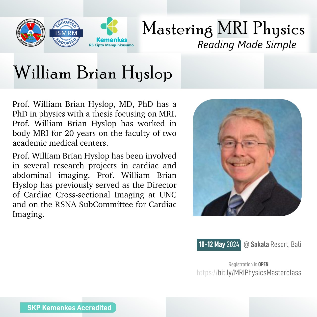 Perhimpunan Dokter Spesialis Radiologi Indonesia (PDSRI) bersama International Society for Magnetic Resonance in Medicine (ISMRM) akan menghadirkan dokter spesialis radiologi dan fisikawan medis untuk pelatihan fisika MRI secara interaktif dan aplikasinya secara klinis pada kasus-kasus dengan MRI.