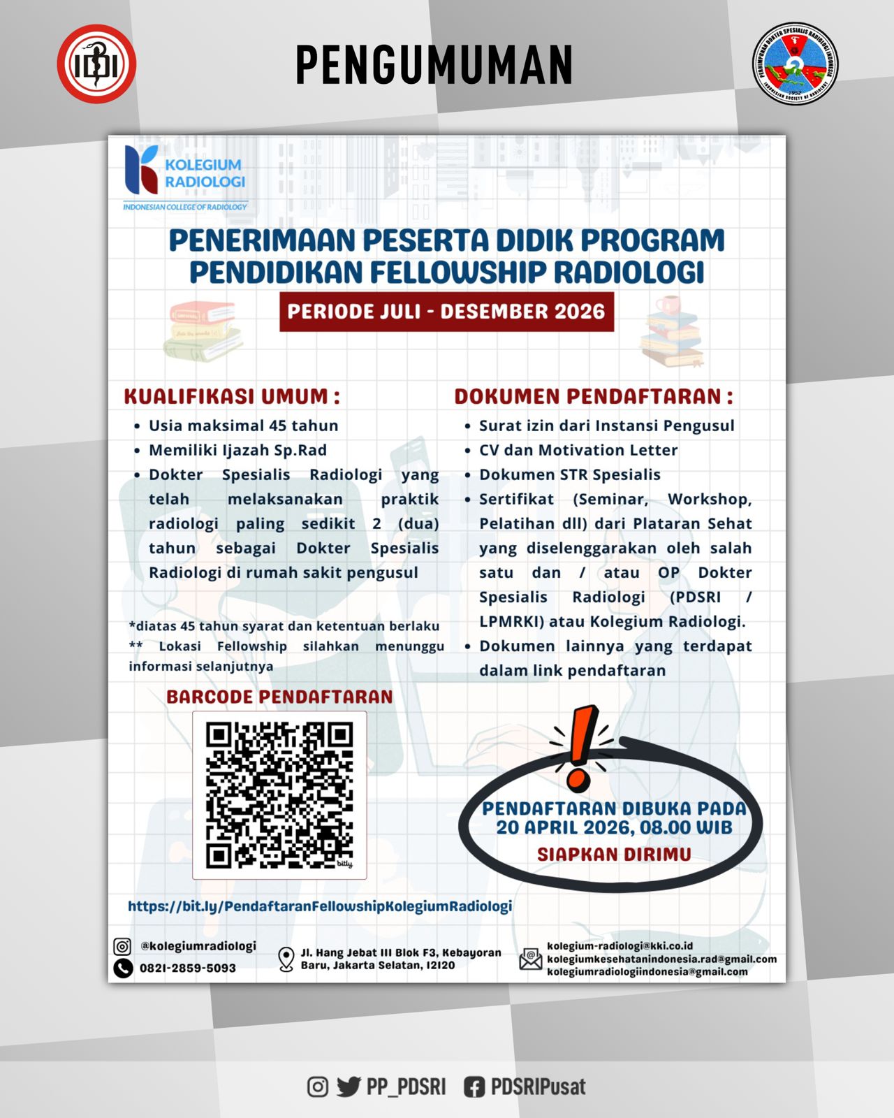 Kepada Dokter Spesialis Radiologi yang berminat agar dapat mempersiapkan dokumen. Informasi Dokumen Persyaratan dapat dilihat melalui link https://bit.ly/PendaftaranFellowshipKolegiumRadiologi